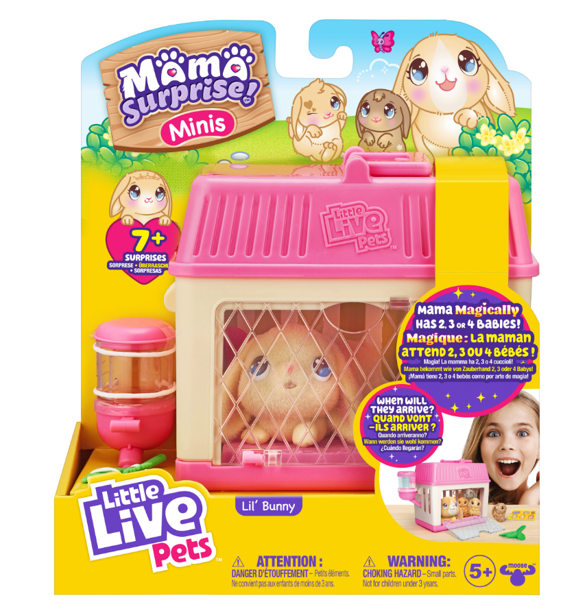 Little Live Pets Mama Surprise takes caring for your pet to a whole new level and now it's available in a mini format. Mama Surprise teaches children to care and nurture for their pet! With the same magical surprise delivery as the original Mama Surprise. Babies magically appear inside the hutch. Kids can go through the surprise and delight of caring for Mama and discovering her babies, again and again.
