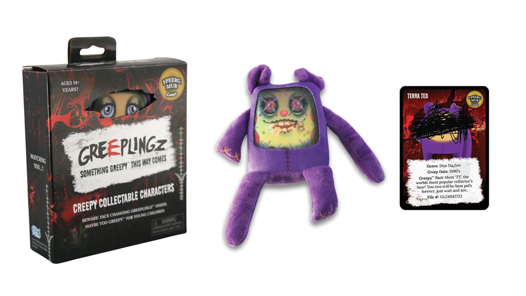Terra Ted, is one of six soft-toy GREEPLINGZ characters from the first “Eeries” (Series) called the YPEERG MUB. Rejected by his owner left him bitter and twisted, watch him expressing a dual personality via his lenticular facial features.