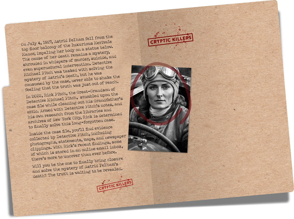 BEST COLD CASE FILE GAME AVAILABLE - Murder at Merivale Manor - On July 4, 1927, Astrid Pelham fell from the top floor balcony of the luxurious Merivale Manor, impaling her body on a statue below. The cause of her death remains a mystery, shrouded in whispers of murder, suicide, and even supernatural intervention. Armed with new evidence, it’s your job to piece it all together and work out who it was that killed the victim.