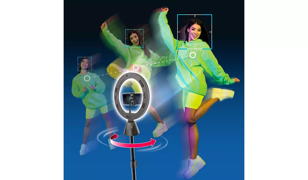 Capture content like never before with the 360 Video Maker Kit. Download the specially designed app to your smartphone and watch the 25cm LED ring light track your face as you move! Record videos to edit later or go live! Kit includes a green screen so you can add backgrounds of your choice. Plus, use the tripod for extra height & flexibility or use without as a desktop device. The perfect kit for any influencer, vlogger, budding actor, football freestyler and more.