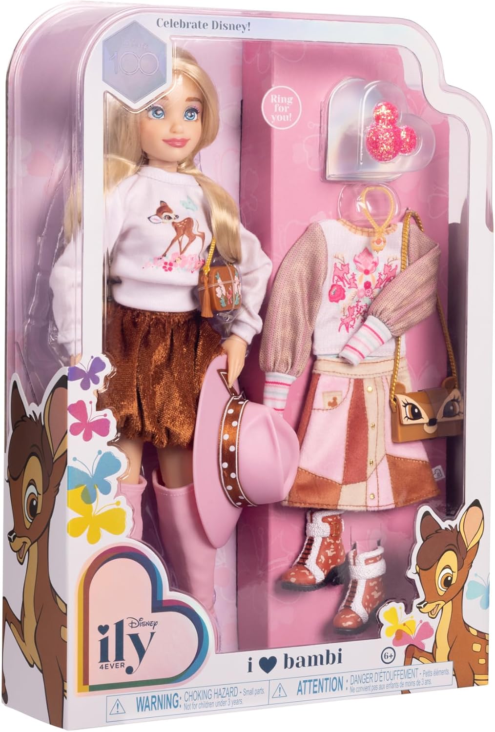 The Bambi inspired Disney doll is a charming addition to any collection, standing out with a stylish pink wide brimmed hat and faux suede skirt.