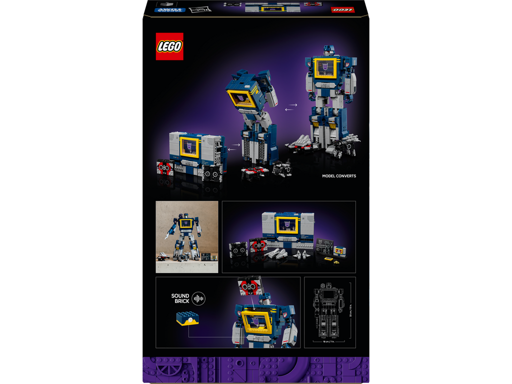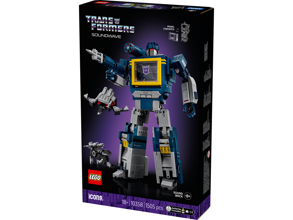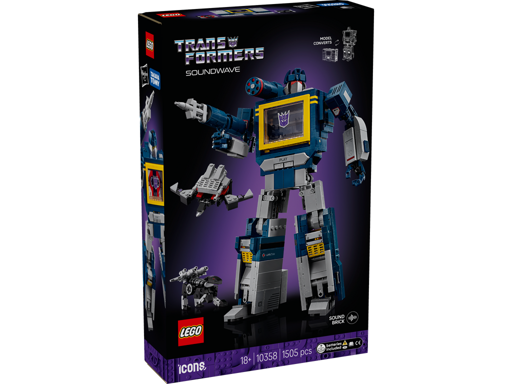 • Collectible Transformers model kit – LEGO® Icons Transformers: Soundwave building project for adults and fans of the acclaimed sci-fi film franchise• What’s in the box? – Everything you need to craft a detailed LEGO® Icons Transformers: Soundwave figure with rocket pod, laser blaster and dart accessories, plus Ravage and Laserbeak figures• Features and functions – Press Soundwave’s play button to activate voice and sound effects, manually convert him to cassette player mode and convert Ravage and Laserbeak to cassette tape mode• A home or office display – Pose the Soundwave, Ravage and Laserbeak figures or catch the robots mid-conversion for a dynamic display• Gift the unexpected – Mark a birthday or any special occasion with this LEGO® Icons Transformers: Soundwave building set for adults and sci-fi film enthusiasts• LEGO® building kit with digital instructions – Get ready to build like never before with the LEGO Builder app, where you can save sets, track your progress, zoom in and rotate your model in 3D• Mindful LEGO® building sets for adults – Explore the inspiring range of creative LEGO projects (sold separately) designed specifically for adults• Dimensions – The Soundwave figure in this 1,505-piece set stands over 33 cm (13 in.) tall
