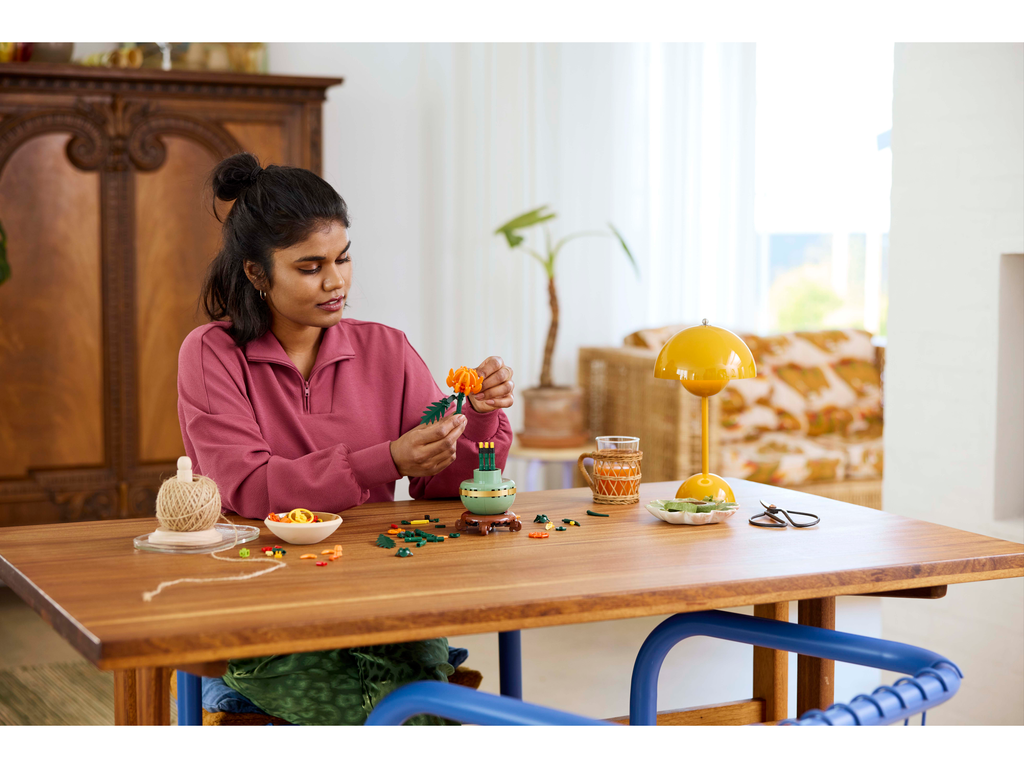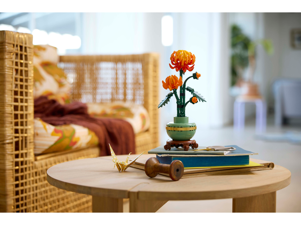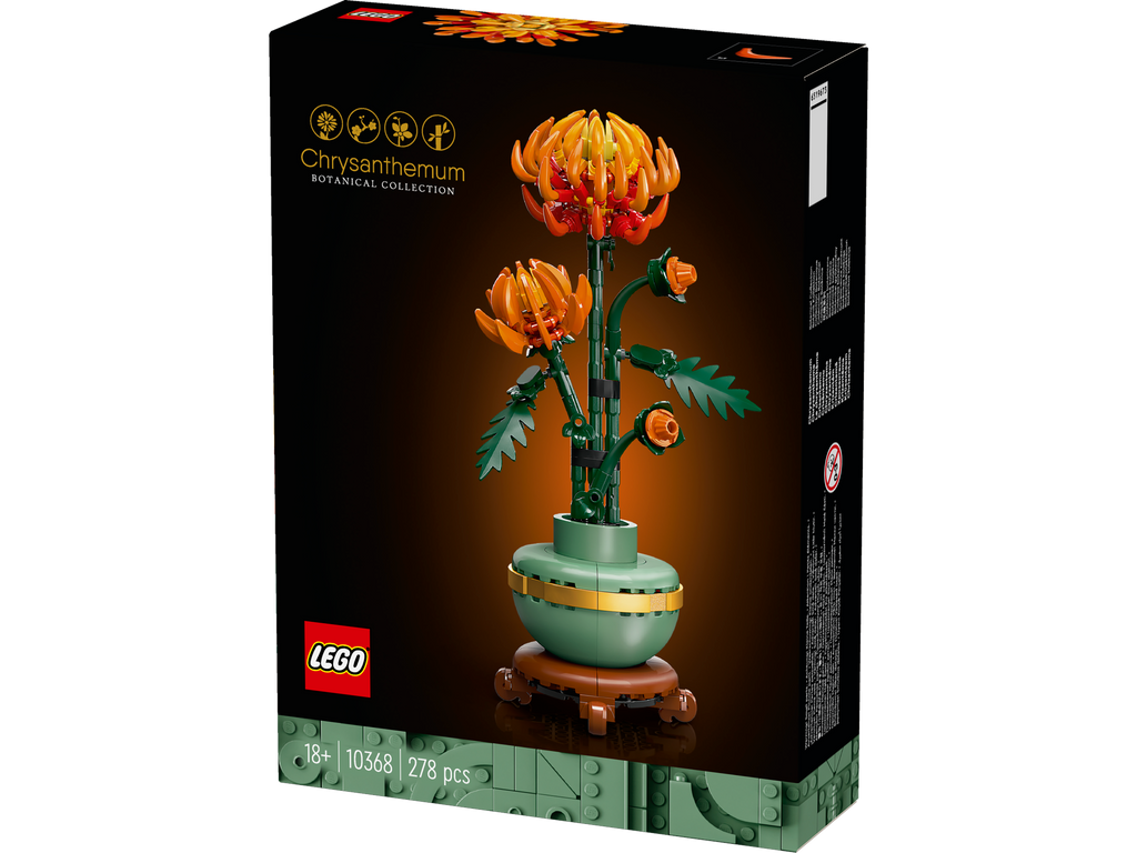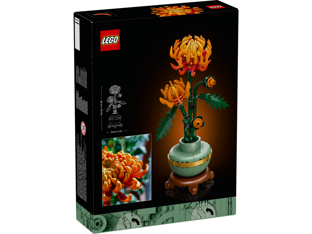 • Buildable chrysanthemum flower decor – Take quality time out or join friends and family for a mindful project with the LEGO® Icons Chrysanthemum building set for adults• What’s in the box – This creative building set includes everything you need to craft a chrysanthemum plant and a pastel-green flowerpot with a golden band and a wood-effect plinth• Blooming buds – The LEGO® Icons Chrysanthemum with posable leaves and petals captures the vivid orange flower in various stages, including 1 in ful l bloom, 1 blossoming and 2 in bud• Maintenance-free home decor – Add a splash of colour to your home or office with this zero-maintenance potted chrysanthemum• A LEGO® plant gift – Celebrate a birthday or any special occasion, or surprise a loved one with a gift designed for adult fans of LEGO building sets, home decor and flowers• Includes digital building instructions – The LEGO® Builder app features a digital version of the building instructions included with this LEGO flower building set• P art of the LEGO® Botanical Collection – Discover a space for relaxation with the wide range of LEGO construction sets designed specifically for adults • Dimensions – The chrysanthemum, including plant pot and plinth, in this 278-piece building set measures over 26 cm (10.5 in.) high, 10 cm (4 in.) wide and 9 cm (3.5 in.) deep