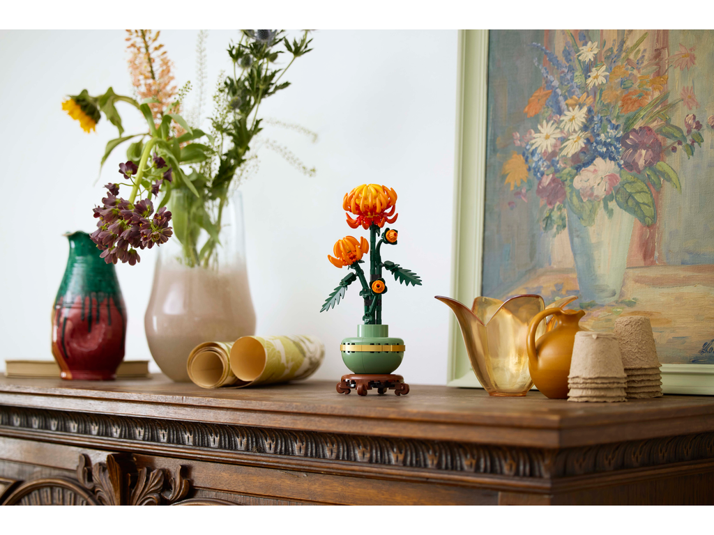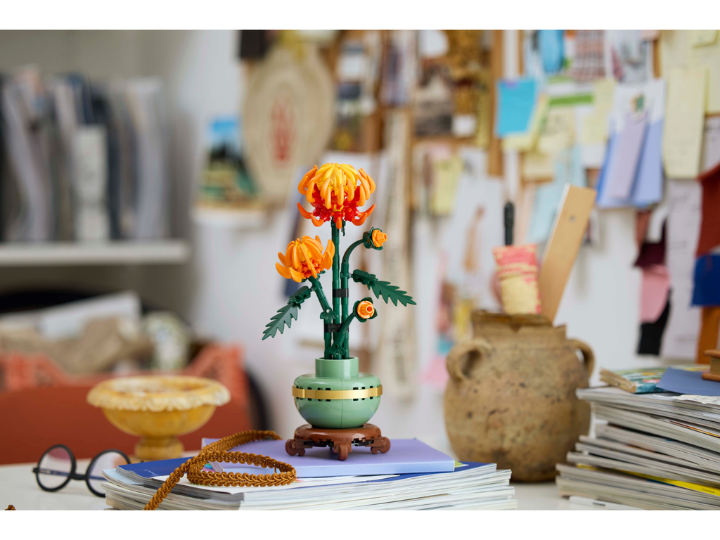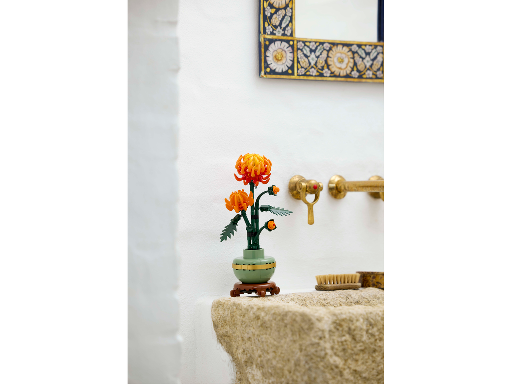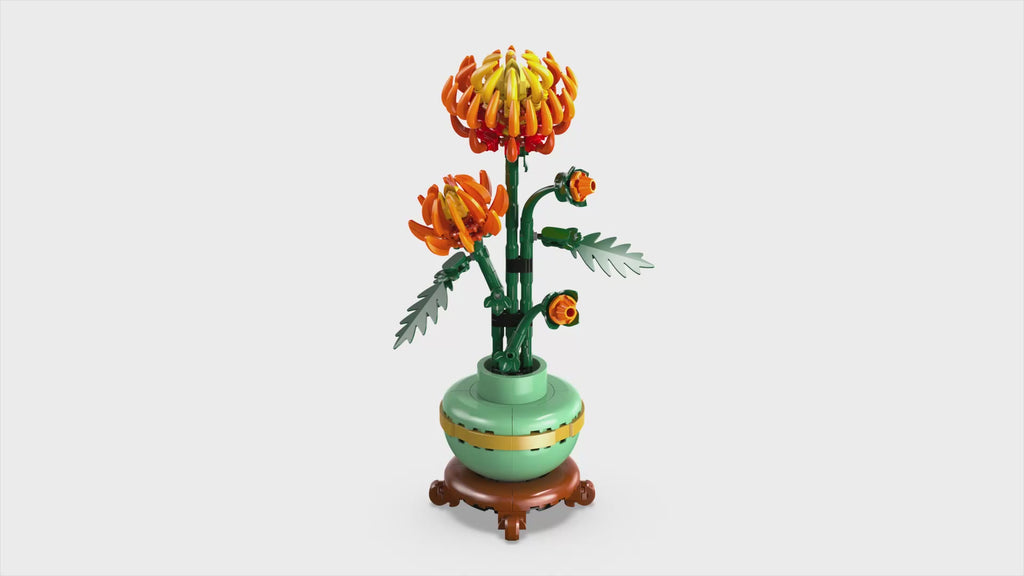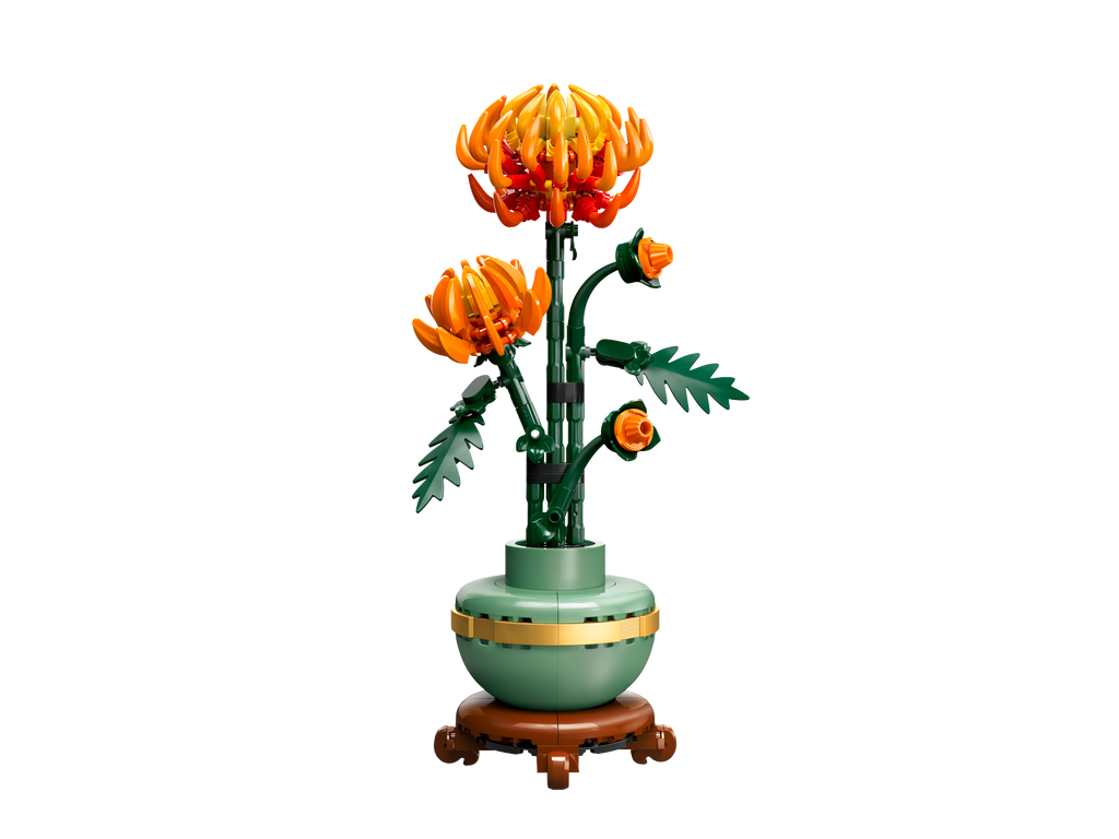 Indulge yourself or gift a loved one with the LEGO® Icons Chrysanthemum building project for adults. This beautiful LEGO recreation with posable leaves and petals depicts the vivid orange flower in various stages of growth, nestled in a pastel-green flowerpot with a golden band and wood-effect plinth. Let your creativity grow as you craft this timeless display piece for the home or office.