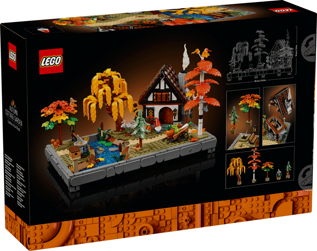- DIMENSIONS – The 1,102-piece LEGO® Icons Autumn Cottage Garden model measures over 19 cm (7.5 in.) high, 29 cm (11.5 in.) wide and 18 cm (7 in.) deep