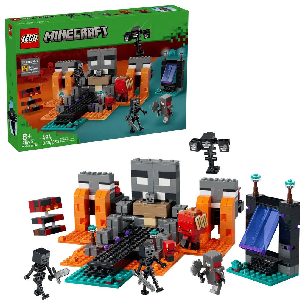 Transport Minecraft® players to endless pretend play possibilities with the Wither Battle (21590) building toy for boys and girls 8 years old and up. Kids join the Crimson Warrior as he takes on 2 skeletons and other mob figures in an explosive adventure in the warped forest biome. Packed with action and authentic Minecraft details, this set includes gaming characters like a Crimson Warrior, 2 wither skeletons, a strider, a magma cube and a buildable wither boss. A Nether portal and a shrine with a crafting table and a hidden wither that kids can summon with an explosion feature bring the game to life. Kids enjoy imaginative, hands-on play as they battle foes, ride the strider and engage in epic adventures – making it a great gamer gift for Minecraft players, LEGO builders and fans of video game toys. And friends and family can team up with Build Together mode in the LEGO Builder app, where everyone has fun building part of the set using their own devices. Set contains 494 pieces.