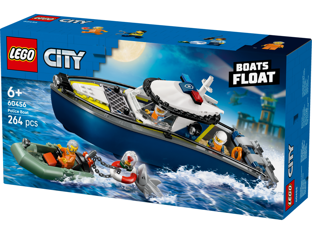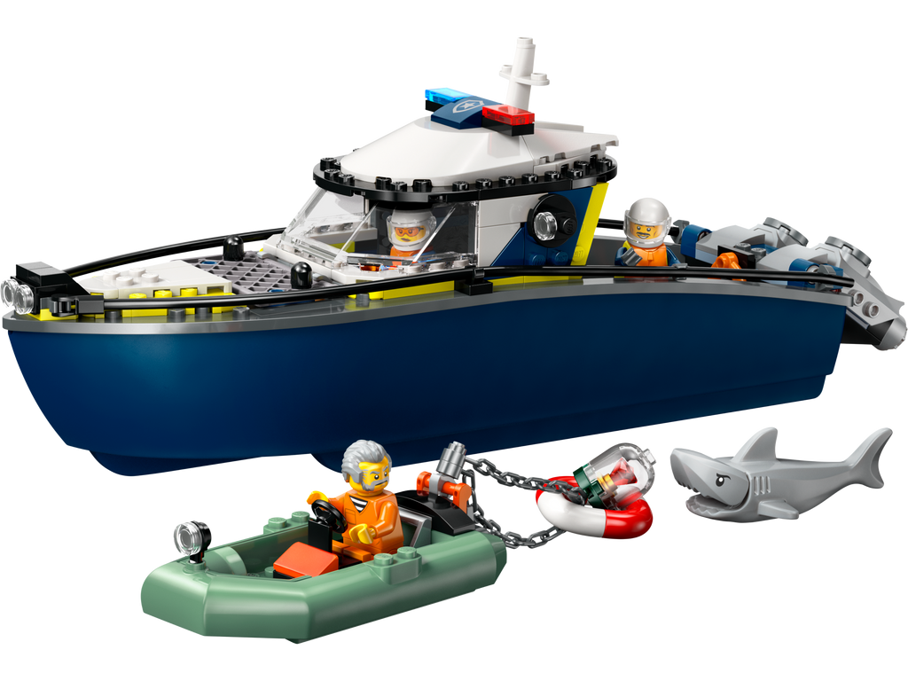 • What’s in the box? – Everything kids need to build a toy policeboat and crook’s power dinghy, plus 2 police officer minifigures, a crook minifigure and a shark figure