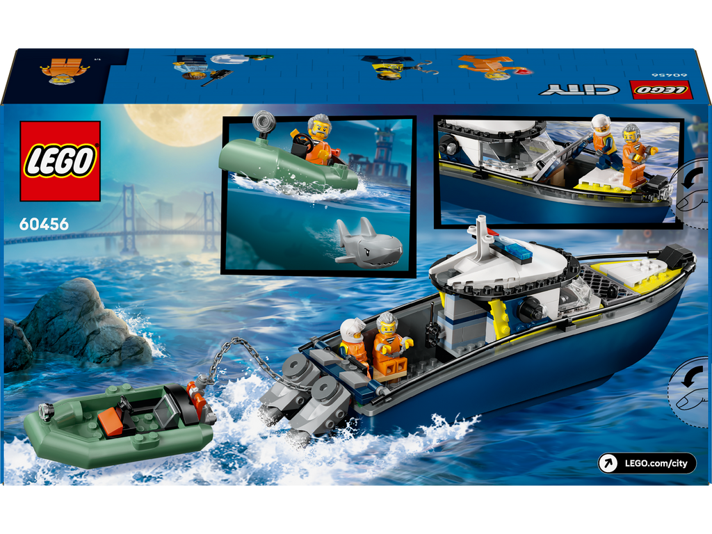 • Police boat chase playset for everyday heroes – Kids can dive into an ocean of action-packed crook-catching adventures with the LEGO® City Police Boat Chase set for ages 6 and over