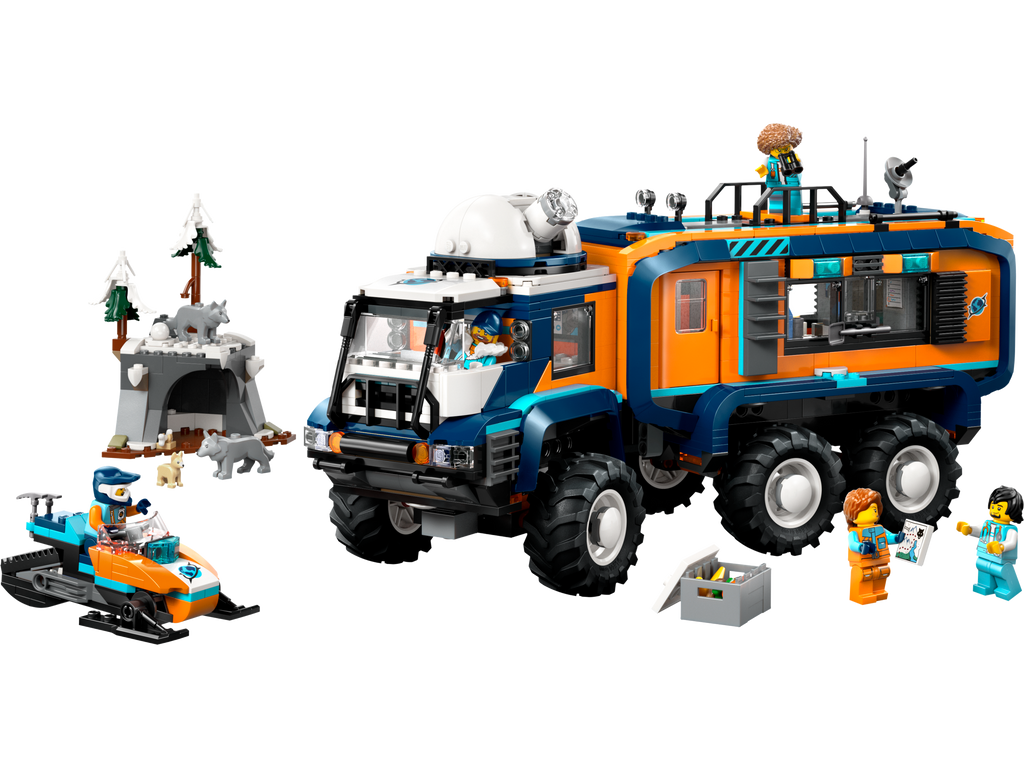 Embark on epic Arctic adventures with the explorer science lab truck. This articulated vehicle with 6-wheel suspension and deep-tread tyres is made to conquer icy terrain. Check out the rooftop observatory, conduct tests in the lab and enjoy the living area with kitchen, bathroom and bedroom. Take the snowmobile on daring expeditions and discover a cave that’s home to a family of Arctic wolves!