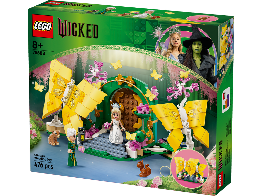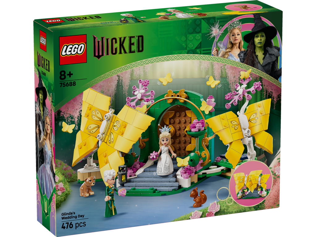 Open up a world of creative activities with LEGO® Wicked Glinda’s Wedding Day (75688) role-play toy for kids aged 8 plus. Girls, boys and fans of Wicked merchandise build this beautiful set then play out the dramatic scene from Wicked: For Good, where Glinda prepares to marry Fiyero. Kids pull apart the giant posable LEGO butterfly building toys to reveal the wedding scene. This fantasy gift packed with recognisable details from the movie, including the wedding cake, is a heart-shaped invitation and Glinda’s bouquet from Fiyero. For authentic role play, Glinda wears the gown and tiara from the movie and has a changeable face as her day flips from delight to disaster when the included animal figures rampage through the scene. When the play is over, kids close the Wicked-themed gift by drawing the butterflies together and display this eye-catching set in their room. This building toy can be used with other LEGO Wicked sets so the movie adventures never end. Set contains 476 pieces.