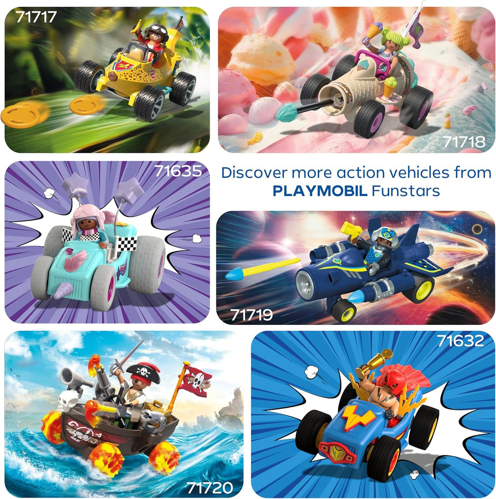 Blast off into high-speed action with the PLAYMOBIL Funstars Racing Space Jet! Packed with rocket projectiles and futuristic gear, this sleek vehicle is built for daring missions and cosmic chases. The space agent grips the controls from his cockpit, ready to launch into orbit or zoom through alien terrain. With glove attachments, a blaster, and helmet, he’s prepped for every challenge the galaxy throws his way. This stellar PLAYMOBIL set delivers turbo-charged fun for kids aged 4 and above. Endless opportunities for imaginative space play among the stars await!