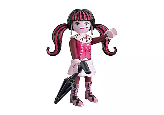 Draculaura™: Gothic glam meets Playmobil charm! Monster High Draculaura™ enchants with her signature pink-and-black style, high-flying flair, and a frilly umbrella so she can take a walk in the sun. With Playmobil’s high-quality detailing, she’s ready to take her place in any spooktacular collection.