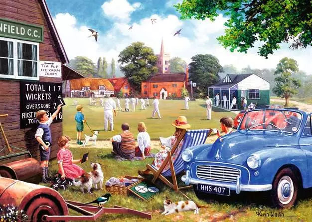 This is the fourth in a series of nostalgic scenes, each highlighting popular ways to spend your leisure time. What better way to spend a sunny Sunday afternoon than by enjoying the local cricket match? You can pack your deckchairs into the car, take a picnic, watch the match and listen to the sound of leather on willow. Even if you're not that much of a fan, you can always take a book and just enjoy the beautiful surroundings and the summer weather. It may even inspire dreams of a glorious sporting future! Wind down from daily chores and pressures and enjoy some mindful moments as you assemble this calming and nostalgic jigsaw puzzle.