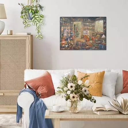 This workshop belongs to a super-skilled toymaker. Brightly painted cars, trains, planes, nutcrackers, horses, spinning tops and puppets cover every surface, pretty doll's houses await collection and a stunning rocking horse is almost complete. Looks like the toymaker has stepped outside, but his patient pets await his return. Relax, unwind and create some mindful moments as you assemble this charmingly nostalgic puzzle.