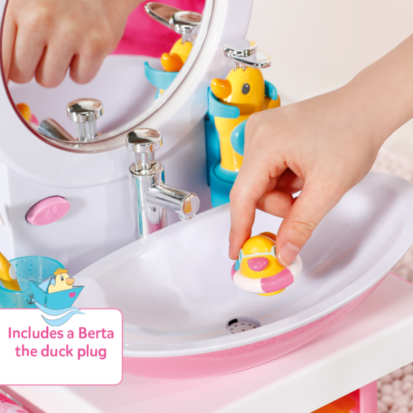 By pressing the pink button, little ones can turn the basin on and watch the mirror light up. When it’s time to wash BABY born’s hands, simply put the duck plug in the sink and press the silver tap to fill the basin with real water! Then, little ones can press the ducky soap dispenser to hear a lovely song play for 20 seconds – the exact amount we should all wash our hands. Once done, they can empty the sink and dry their hands on the little towel.